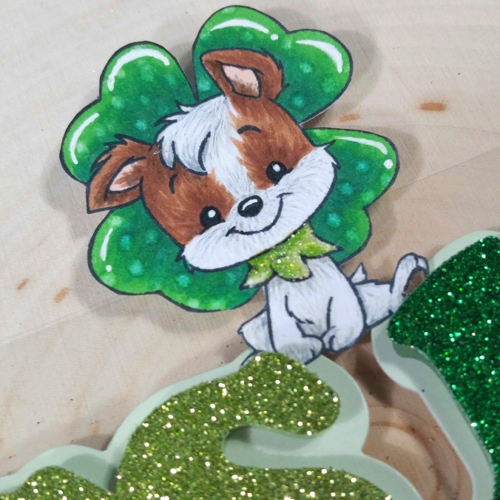 I found a great glittery 3D title by Paper House Productions at Tuesday Morning for just $0.99 (regular price: $3.49) and I knew I could make it personalized by adding the 4 Leaf Puppy, colored up to look like my pup, Bandito. I used the following Copic colors: